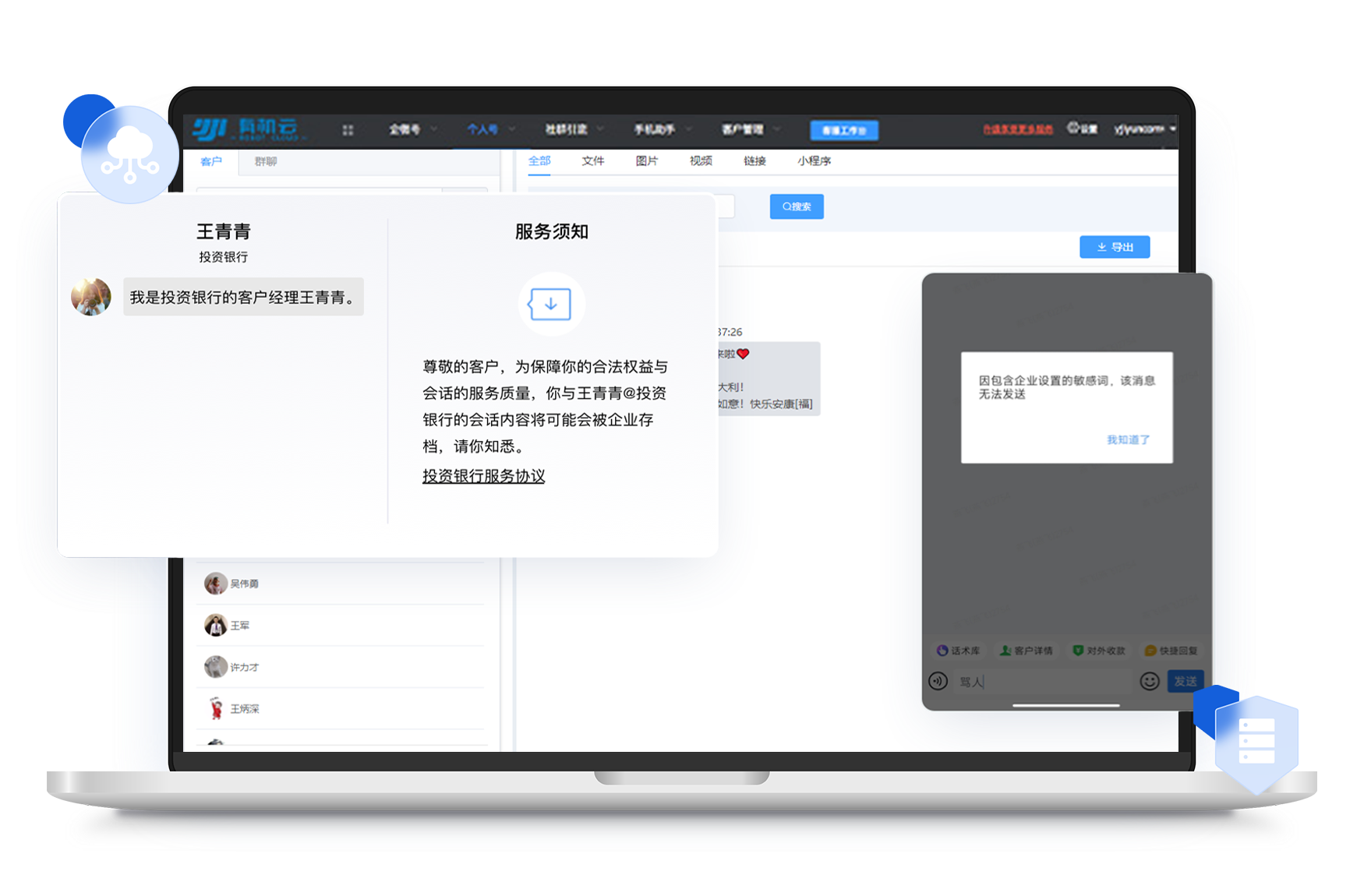 帮助企业合规获取范围内员工的工作社交数据,包括图文、语音、文件、视频、撤回消息等,客户资料长久保存