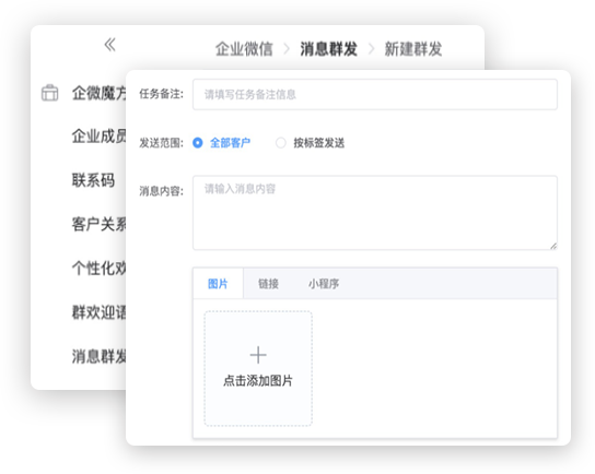 • 消息群发 群发内容支持文字、图片、视频、小程序等