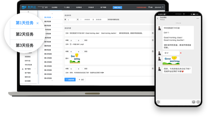 支持对社群或用户个人的SOP任务:第一天、第三天、第七天的推送策略,标准化的推送规则可复制到上百个群,上千名用户。